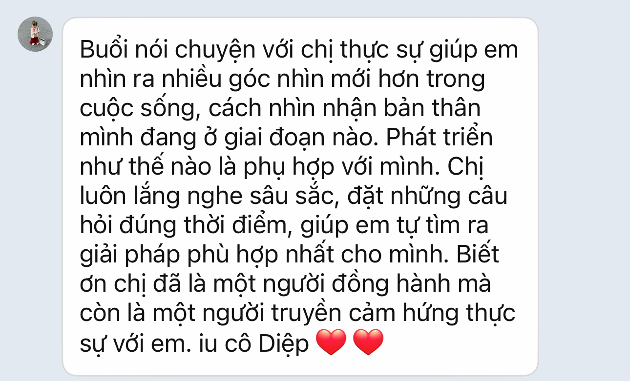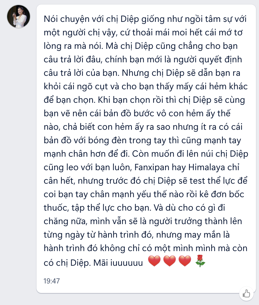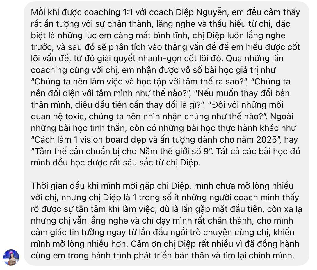 Hai là tạo lộ trình phát triển và đồng hành: Sau khi trải qua coaching 1:1, có thể bạn sẽ muốn có một lộ trình phát triển cụ thể hơn để đạt được mục tiêu. Tôi sẵn sàng đồng hành cùng bạn trong một khoảng thời gian nhất định để giúp bạn vươn tới những thành công mà bạn mong muốn. Và hãy yên tâm, bạn không có bất kỳ rủi ro nào, chỉ có cơ hội phát triển!
