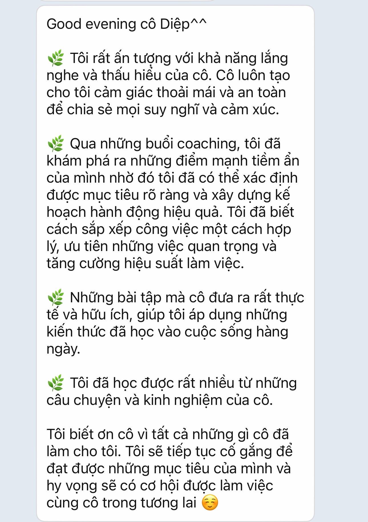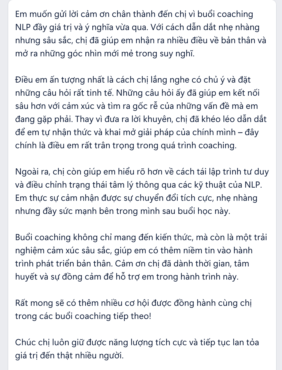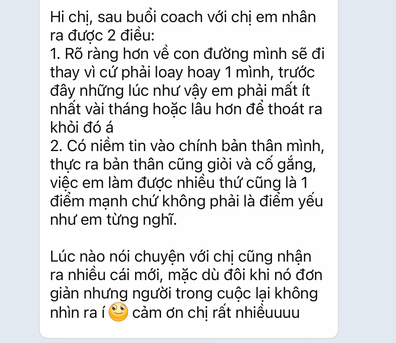 Hai là tạo lộ trình phát triển và đồng hành: Sau khi trải qua coaching 1:1, có thể bạn sẽ muốn có một lộ trình phát triển cụ thể hơn để đạt được mục tiêu. Tôi sẵn sàng đồng hành cùng bạn trong một khoảng thời gian nhất định để giúp bạn vươn tới những thành công mà bạn mong muốn. Và hãy yên tâm, bạn không có bất kỳ rủi ro nào, chỉ có cơ hội phát triển!